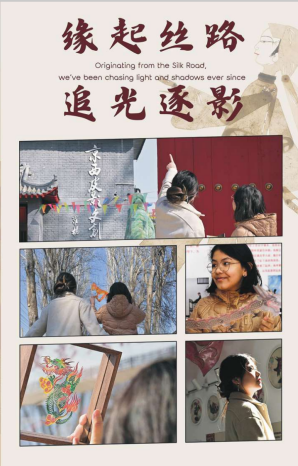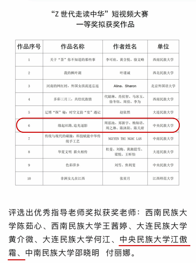 二人麻将本科生杨灿语、周泓池和研究生郑新宇团队的作品《缘起丝路,追光逐影》荣获大赛一等奖。同时,江傲霜老师获评“优秀指导老师”荣誉称号。