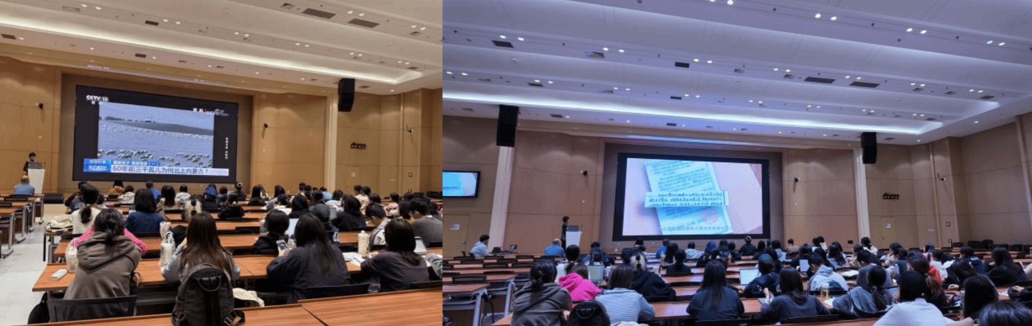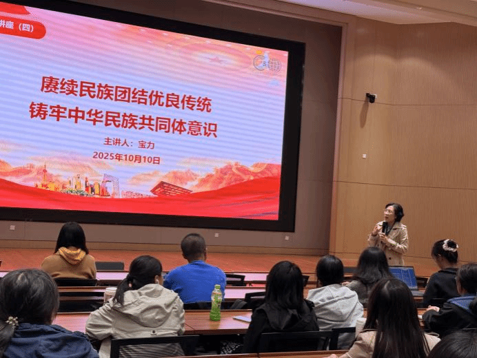 作为“国家的孩子”的后代,宝力布森老师以独特的家庭记忆为切入口,讲述了三年自然灾害时期,党和国家转移南方孤儿至内蒙古,牧民以“接一个、活一个、壮一个”的信念抚养孤儿的历史。讲座中,宝力布森老师讲述多个“国家的孩子”的真实故事,让在场师生感动落泪。她特别提到,国家正通过现代基因技术为寻亲者搭建“血脉桥梁”,让不少家庭在分离半个世纪后团聚:“那些相拥而泣的画面里,藏着国家对每一个生命‘不抛弃、不放弃’的郑重承诺。”