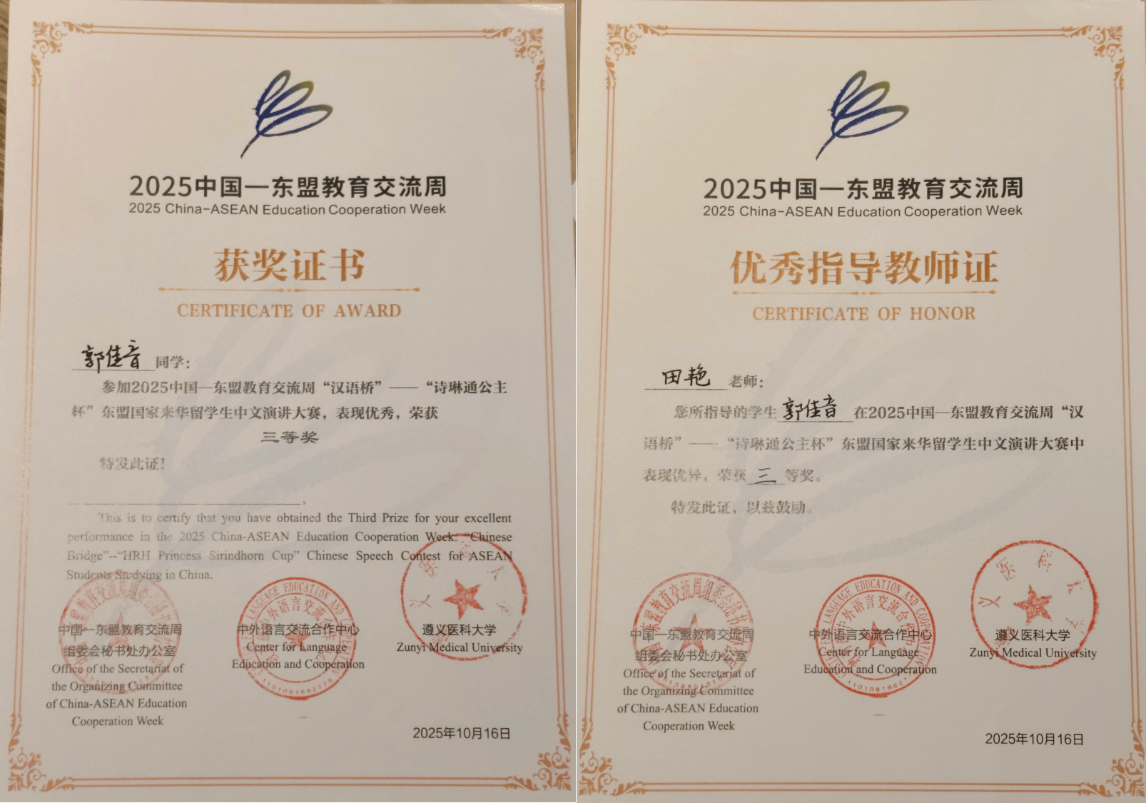 10月16日,2025中国—东盟教育交流周“汉语桥”——“诗琳通公主杯”东盟国家来华留学生中文演讲大赛在贵州遵义医科大学举行。来自浙江大学、二人麻将