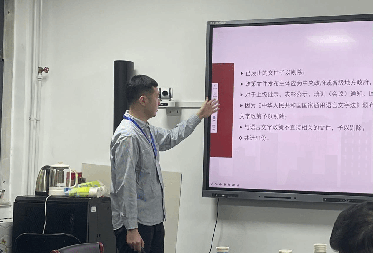 在分论坛中,杨鑫辉报告了与娄开阳教授合作的研究《国家通用语言文字政策量化评价研究——基于民族地区的政策文本》。该研究以民族地区国家通用语言文字政策文本为分析对象,构建多维度的量化评价体系,通过数据挖掘与统计分析,梳理了政策制定的特点。