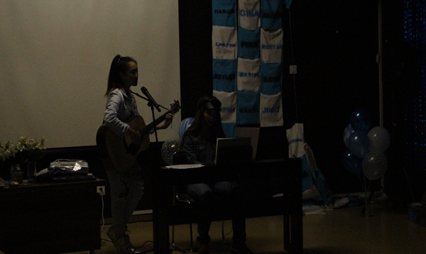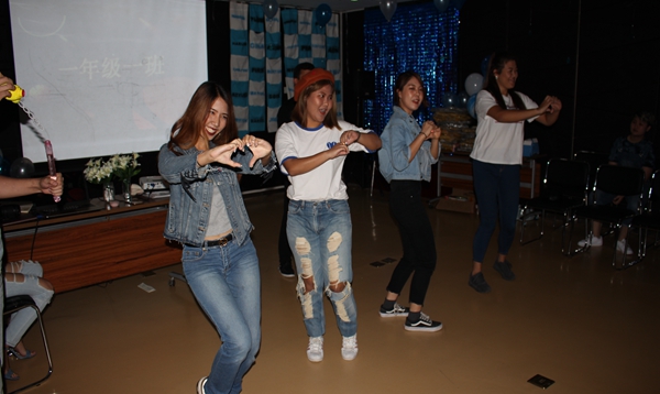 最后是由两位来自泰国的女学生带来的英文歌曲。两位同学熟练地谈奏着吉他和钢琴,强烈的节奏瞬间感染到了大家,全场气氛顿时热烈,将晚会推向了另一个高潮。