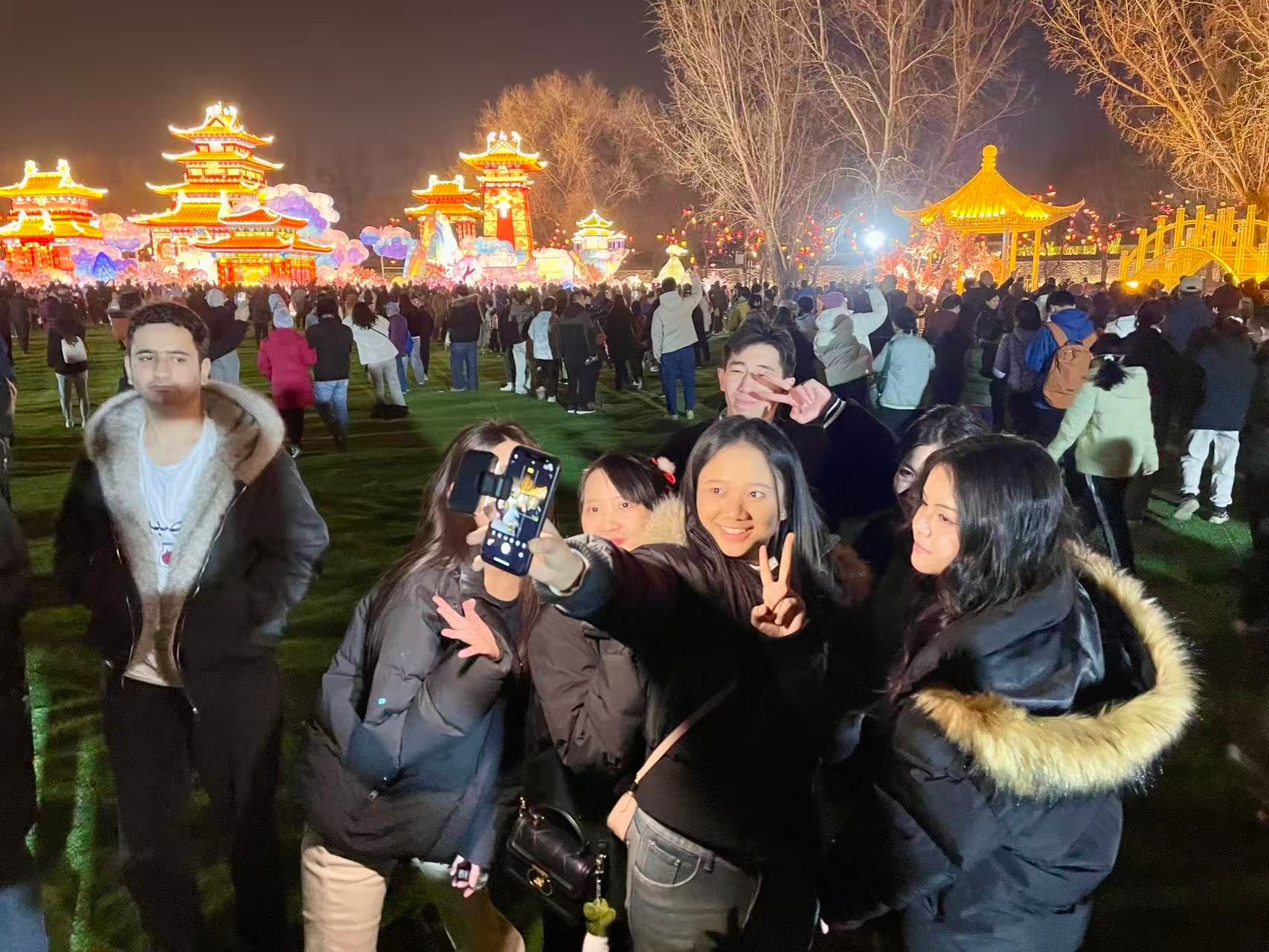 夜幕初垂,华灯绽放,圆明园内已是游人如织,处处洋溢着喜庆祥和的节日气息。形态各异、色彩绚烂的大型灯组将这座古老的皇家园林装点得流光溢彩、美不胜收。留学生们漫步于璀璨灯海之中,被眼前的美景深深吸引,不时驻足观赏、拍照、交流讨论。从帝王华盖到宫灯龙船,从十二生肖传说到古典建筑仙境,每一组彩灯都蕴藏着深厚的文化底蕴与历史典故,让同学们在感受光影魅力的同时,上了一堂生动的中国文化体验课。