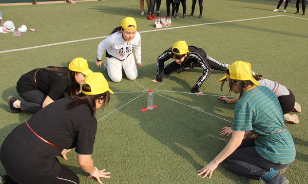 第二个游戏是“炸弹”处理。这个游戏难度颇高,每个学生在腰上系好绳子以后,需要趴到地上,并把所有的注意力都集中在“炸弹”的处理上,这个游戏不仅是速度的体现,更是团队协作的最好诠释。