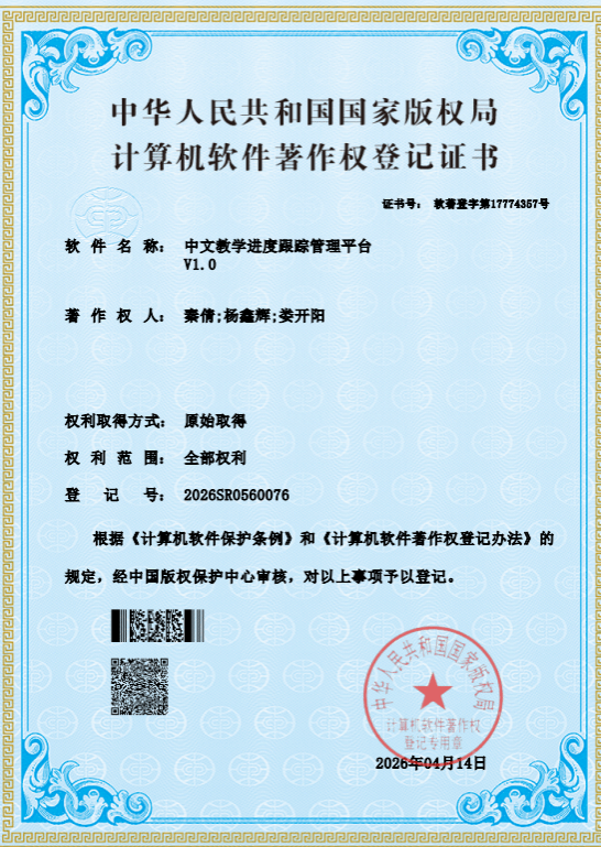 娄开阳教授与博士研究生秦倩、杨鑫辉共同开发的《中文教学进度跟踪管理平台V1.0》喜获国家计算机软件著作权登记。