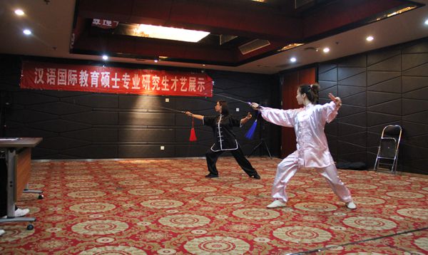 12月4日下午,太极类才艺展示如期举行,学生多以两人一组的形式搭配展示太极剑。每组展示结束后,评委老师给予了专业细致的点评。这不仅对规范大家的招式起到了引导作用,也有助于大家在走上汉语教学岗位后,更好地去展示和传播这门中华才艺。