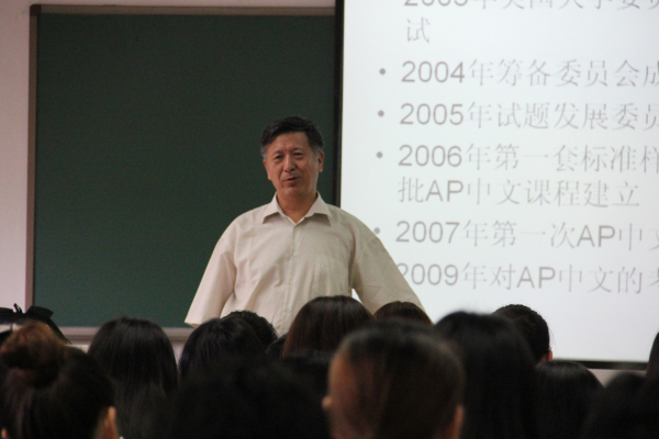 邀请,在我校文华楼东区403教室为2017的汉语国际教育专业研究生进行了一场题为“美国AP中文考试”的讲座。