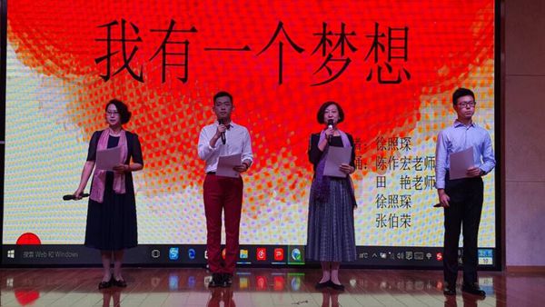 陈作宏老师,田艳老师和二人麻将学生张伯荣、徐照琛声情并茂的师生朗诵《我有一个梦想》,那慷慨激昂的语调点燃了同学们内心的情感,深深地被感动了。