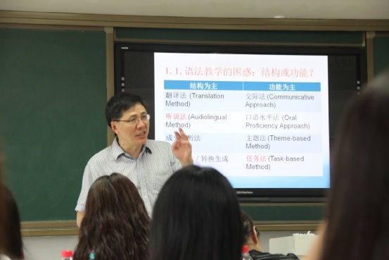 朱永平教授曾执教于普林斯顿大学、华盛顿圣路易斯、和密西西比大学,并且长期从事着教学和科研的相关工作。此次讲座主题为《控制式联想教育法:初级、中级教学与课堂实例》此次系列讲座包括理论与实践:控制式联想教育法、相关关式提问法两个部分。第一部分从结构与功能的联系与区别入手,紧密联系教学实践,阐释了一直以来困扰汉语教师的语法教学问题。第二部分朱老师分享了在日常教学中遇到的问题,也为我们日后的汉语教学就提问方面给了中肯的建议,同学们从中都受益匪浅。