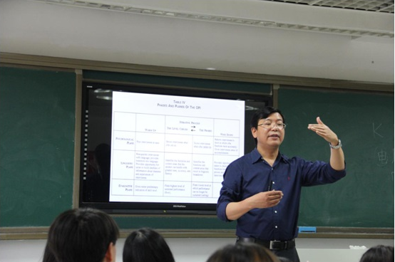 黄南松教授毕业于中国人民大学和斯洛文尼亚卢布尔雅那大学,获得学士、硕士及博士学位,先后在中国人民大学、斯洛文尼亚、奥地利等地工作。2002年到美国,任教于哈佛大学和南加州大学。曾两次获得中国人民大学优秀科研成果奖、两次获得哈佛大学优秀教学奖,他是对外汉语教学界的专家。此次讲座主题为美国外语教学学会口语水平测试,讲座主要围绕美国外语教学学会口语水平测试的结构、主要分级和意义展开,目的是让学生了解OPI,在讲座的最后部分,黄教授还播放了一段口语水平测试的面试录音,请同学们当考官来判断面试者的中文口语等级,讲座现场气氛活跃,同学们积极发言,黄教授耐心答疑,呈现出一片融洽的场面。