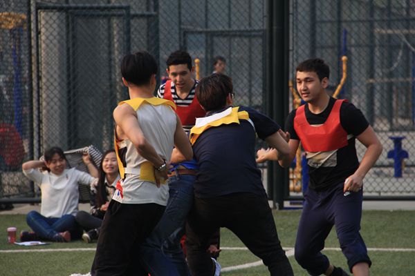 第四个项目是最近非常流行的撕名牌,也是这次趣味运动会期待度最高的项目,流行无国界,所有国家的留学生都积极参与到这项游戏中来,大家分成红黄两队,在一定的场地内撕掉对方背后名牌最多的队伍获胜。大家采用各种“战术”,场面极其热闹。一场下来虽然很累,但大家的脸上是抑制不住的欢乐。