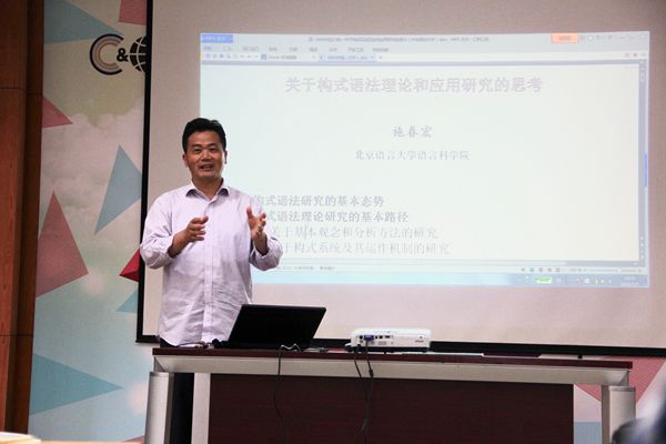 讲座伊始,施春宏教授向大家介绍了构式语法的基本概念和态势,也对现代语言学领域语言研究中的一些基本观念做出了新思考。接着,施教授又向大家介绍了构式语法研究的基本途径,就其分析方法和运作方式的研究做了详细幽默的讲解。同时,讲述了构式语法应用研究的主要空间,使在座学生开拓了视野和思维,对语法研究有了更深的见解。