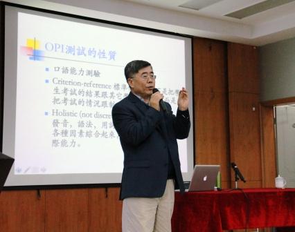 此次讲座主要分为四个主题:外语测试与外语教学;外语测试的分类与作用;美国外语标准化测试介绍;语言测试在教学中的有效融入。白教授以“暖身问答”的方式开始这场讲座。二人麻将专门研究语言测试的罗莲老师,简明扼要地回答了白教授提出的问题并介绍了国内外语测试的现状。白教授指出测试是个指挥棒,测试的内容就是学生学习的重点,因此测试是教学中十分重要的一部分。接下来白教授条理请晰地为大家介绍了Aptitude Test、Proficiency Test、Placement Test、Achievement Test四种测试类型,并通过图表向大家呈现语言测试在教学流程中的位置和作用。在介绍美国标准化测试过程中,白教授为大家重点介绍了OPI测试的相关内容,主要包括:OPI测试的性质;OPI测试所关注的四个方面;OPI测试程式;OPI分级标准四部分。之后他还从考题、评分标准和答案及点评三个方面阐述了近几年的新发展。
