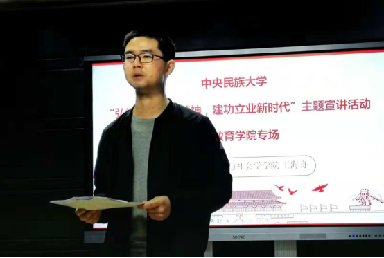 王海舟老师结合自己十年来的辅导员工作,讲述了自己立足岗位,爱国爱校,尽心尽力真诚服务师生,认真履行工作职责,把青春献给民大的感悟和体会。