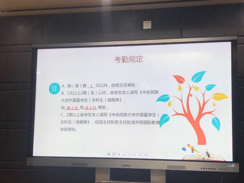 外国本科生教研室副主任白老师以及班主任范老师也对学生们提出了新学期的新希望,希望同学们都能以高标准要求自己,努力学习。主管外国本科生管理工作的龚老师就考勤情况给大家上了别开生面的一课,采取提问方式再次强调了同学们的考勤。外国本科生教学办的钱老师结合自己的工作情况,向同学们详细介绍了教学上的一些规定和要求,并给同学们传授了一些很实用的学习技巧和在中国生活的注意事项。
