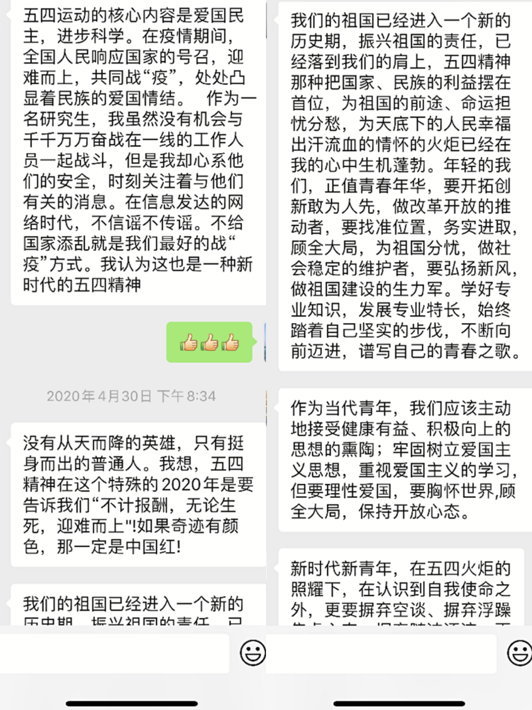 2020年中国及世界都在面临着一场重大的疫情冲击。在这场疫情下,许多青年们也在发挥着“五四”精神,他们大义凛然,义无反顾冲上一线,在这场战斗中救死扶伤,甚至献出了自己宝贵的生命,同学们在了解了一些事迹后,表达了对五四精神的新感悟、新理解。