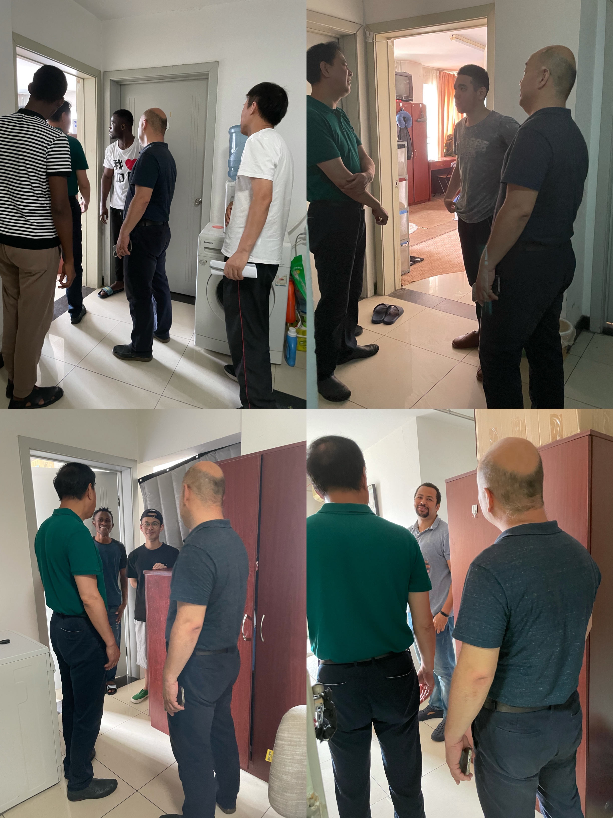 领导挨个走访每名在校国际学生宿舍,询问学生近期学习、生活情况,了解毕业生今后打算,排查宿舍安全隐患。