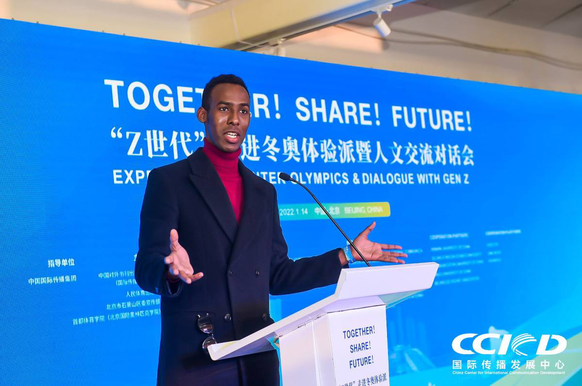 在人文交流对话会中,我校索马里学生阳光作为在京外国青年代表,参与了全球青年对话会这一环节。他说:“在奥运时刻,来自不同的国家、不同地方的人,通过运动团结起来,互相接受彼此,这就是美好的事情。”他也非常期待2022年北京冬奥会的精彩比赛,希望北京冬奥会和冬残奥会顺利举办。
