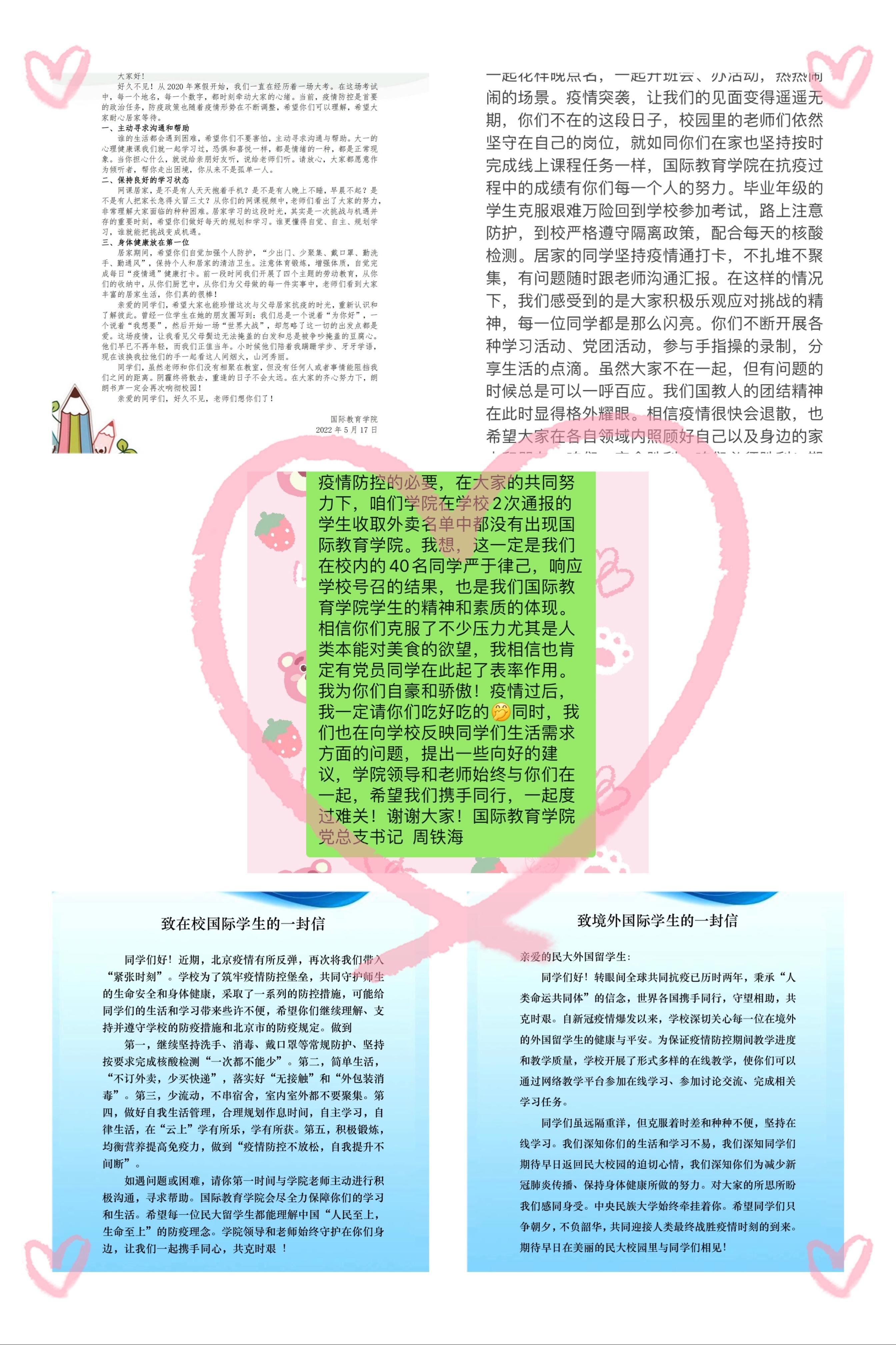 通过微信公众号向各层次中外学生先后发布了《周铁海书记致在校中国学生的一封信》、《给校外本科生的一封信》、《致二人麻将