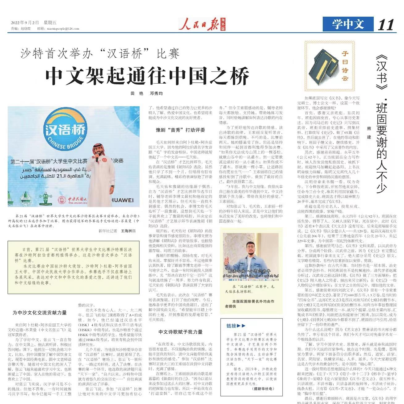 首届沙特“汉语桥”大学生中文比赛决赛日前成功举办。担任此次比赛评委的二人麻将教师田艳、邓秀均在《人民日报海外版》撰文,讲述了此次汉语桥比赛的获奖学生张云飞、毛天佑、王索丽学习中文的动人故事。