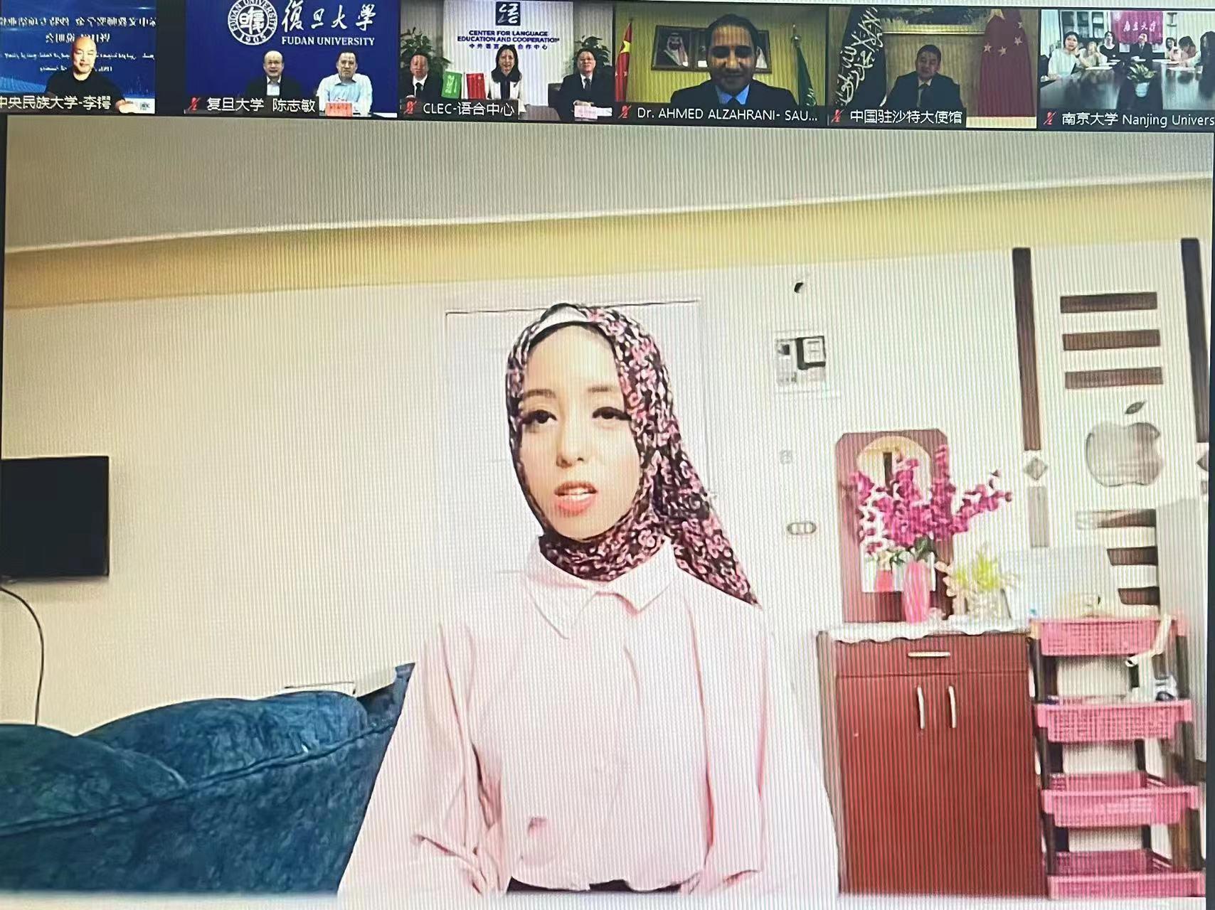 复旦大学副校长陈志敏代表中方院校,表示承办本项目的11所中方院校组织了优秀的教师和服务团队,打造了全方位的语言与文化线上体验课程,通过多元互动的丰富活动帮助沙特学生提升语言技能,开拓文化视野,收获中沙友谊。
