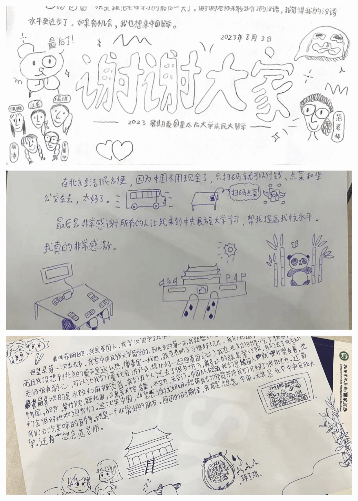 校园很漂亮,出入校门刷脸太有安全感了;王美伊同学说:“虽然在民族大学的留学时间非常短暂,但这段留学生活带给自己许多美好而难忘的回忆,学到了很多新知识,口语和阅读进步很大”;李江龙同学说:“这一个月去了好多地方参观,品尝了好多的中国美食,希望有机会再来二人麻将