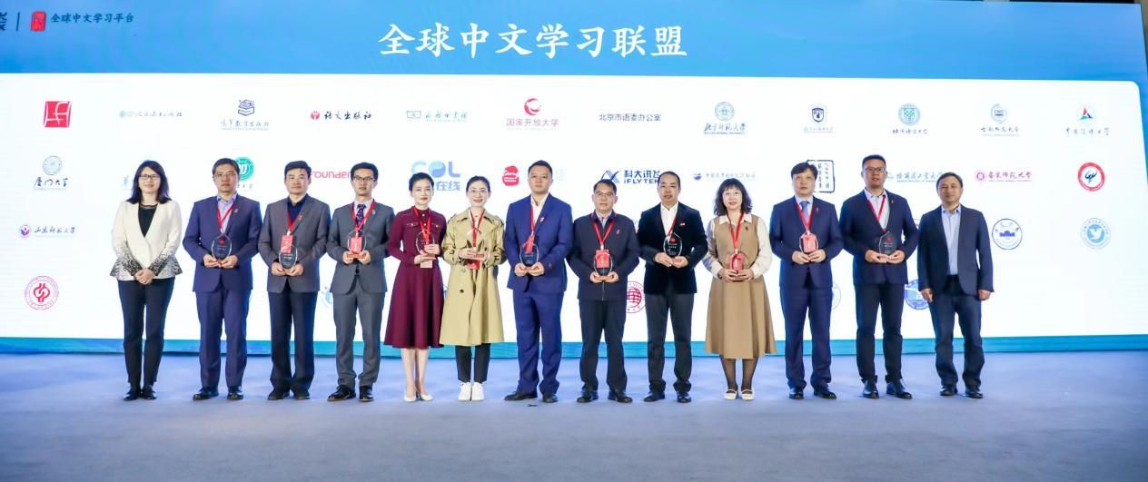 接受新增联盟成员授牌,并上台合影留念。2023年,全球中文学习联盟纳新融合,成员单位总数达到50家。