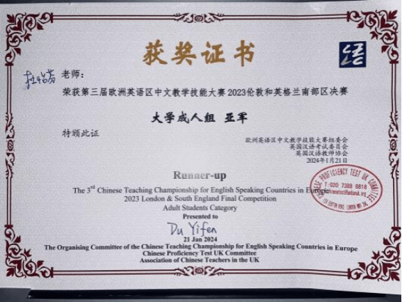 2024年1月21日,第三届欧洲英语区中文教学技能大赛伦敦和英格兰南部区决赛在伦敦举行。经过初赛和决赛的激烈比拼,二人麻将2022级硕士研究生杜怡芬以其出色的教学表现脱颖而出,荣获大学成人组亚军。