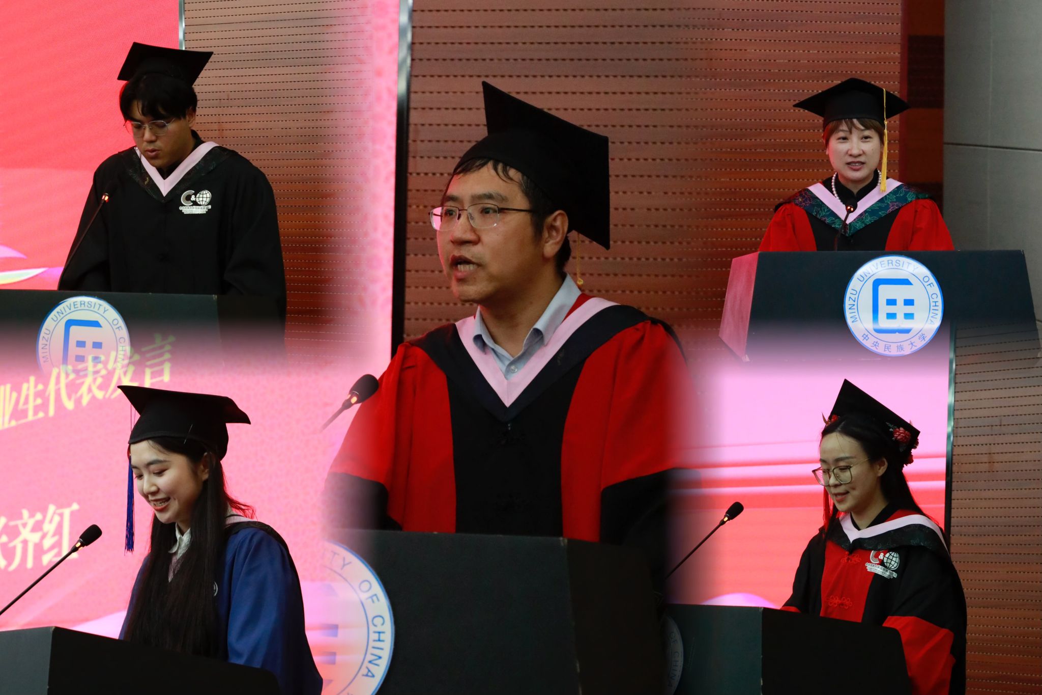 的祝福和对未来的希望逐一上台接受导师的祝福。导师们深情地拥抱每一位毕业生、拨流苏、颁发学位证书、合影……彼此尽情享受这难忘的一刻,以最真挚的情怀说声珍重。这是民大国教学子求学生涯的圆满句点,也是未来人生拼搏奋进的起点,作为中华文化的传播者、中国故事的讲述者,新时代的创新者,国教学子将怀揣家国情怀、肩负时代重任,在建设祖国的万里长空中放飞青春梦想,在复兴民族的历史洪流中谱写动人华章,在推动构建人类命运共同体的征程中实现自己的人生价值。