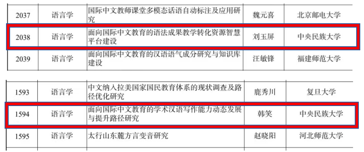 刘玉屏老师的课题“面向国际中文教育的语法成果教学转化资源智慧平台建设”喜获国家社科基金一般项目立项;韩笑老师的课题“面向国际中文教育的学术汉语写作能力动态发展与提升路径研究”喜获国家社科基金青年项目立项。