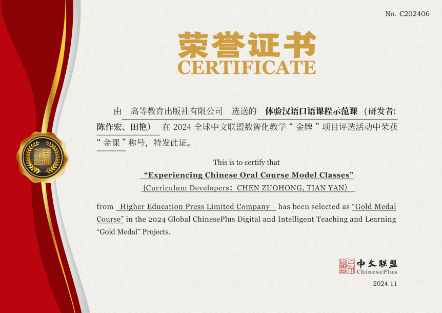 本次“金课”由中文联盟、世界汉语教学学会智慧教育分会、五洲汉风网络科技(北京)有限公司从众多课程中进行评选,全球最终获得此项殊荣的课程仅有29门。评选旨在促进国际中文教育的数智化发展,展示优质教学资源,为教师和学生提供更好的学习平台。