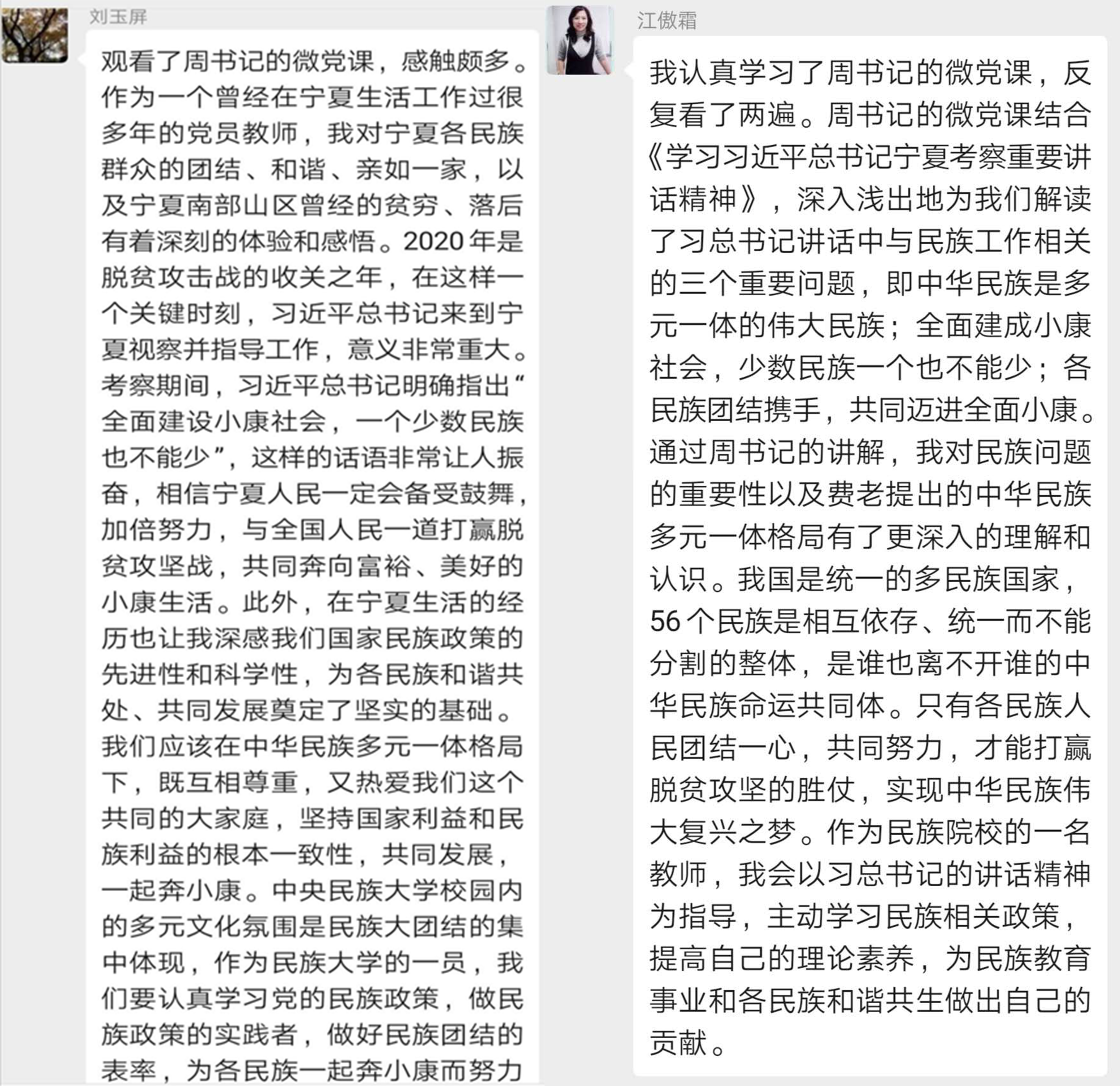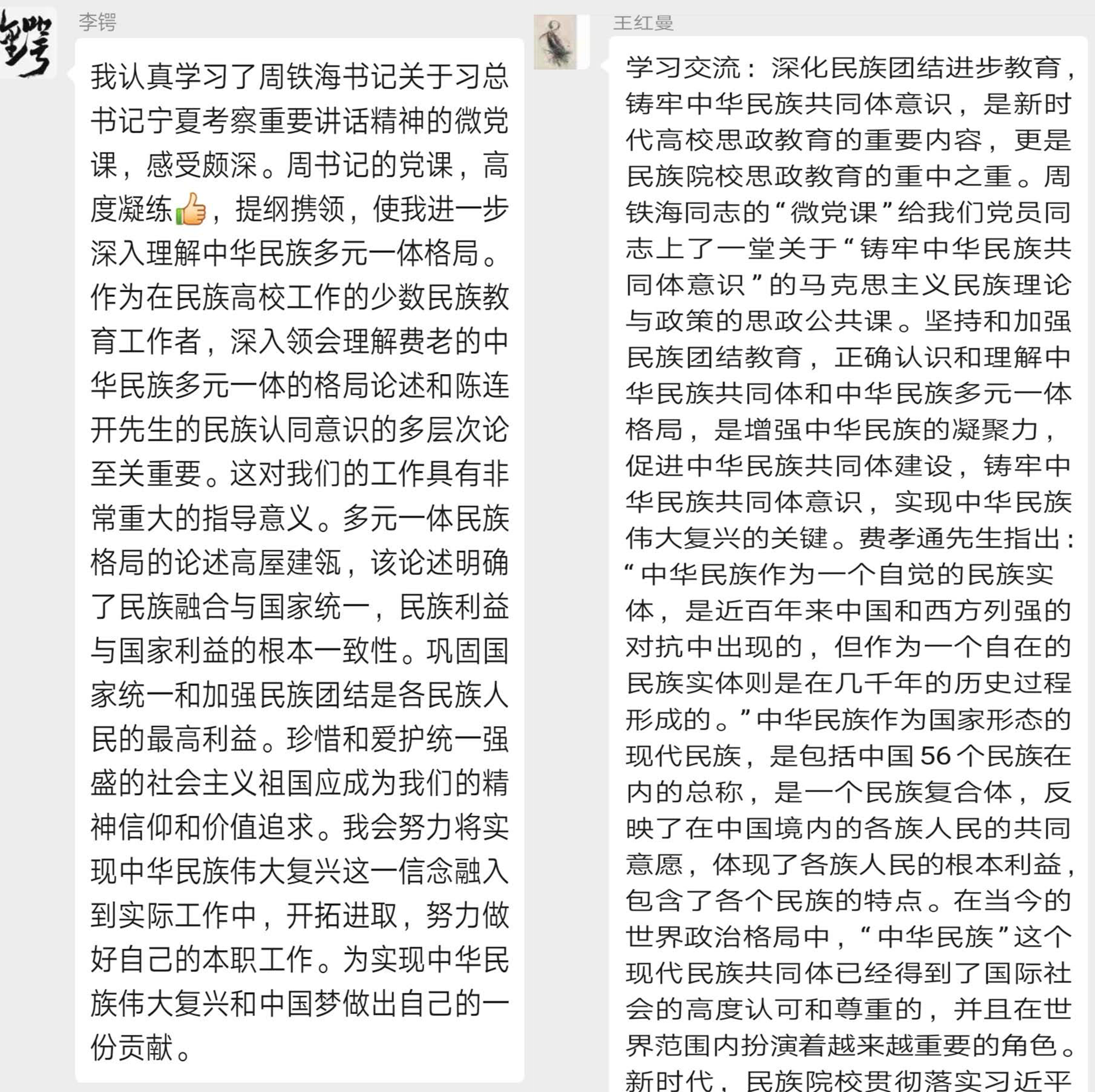 学习微党课后,包括李锷副书记、王红曼组织员和江傲霜委员等在内的二十多位教工党员认真发表了自己的感想,大家一致认为做好民族团结工作,让各民族群众脱贫致富,过上好日子,迈向全面小康,是做好民族工作的应有之义,而深化民族团结进步教育,铸牢中华民族共同体意识,是新时代高校思政教育的重要内容,更是民族院校思政教育的重中之重。