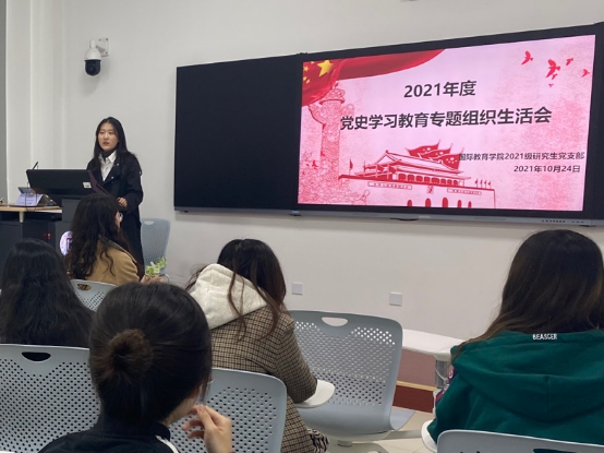 2021级研究生党支部在明德楼122教室召开党史学习教育专题组织生活会,共有22名学生党员通过线上、线下方式参加会议。会议由2021级研究生党支部书记王梦月主持。