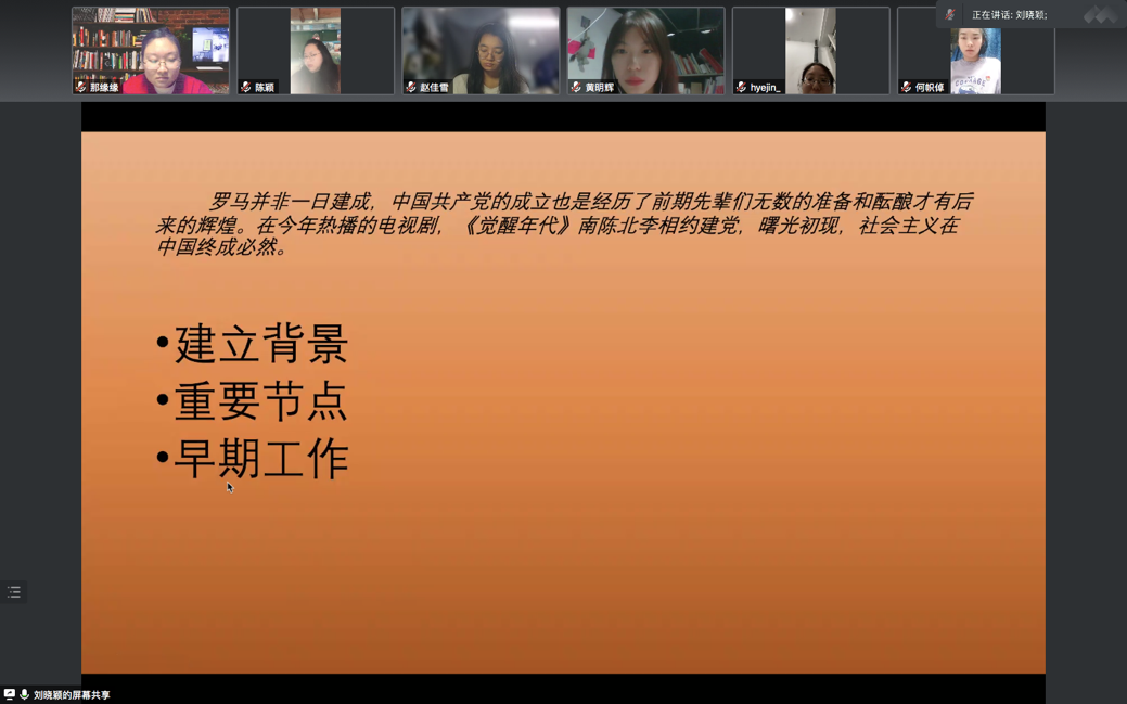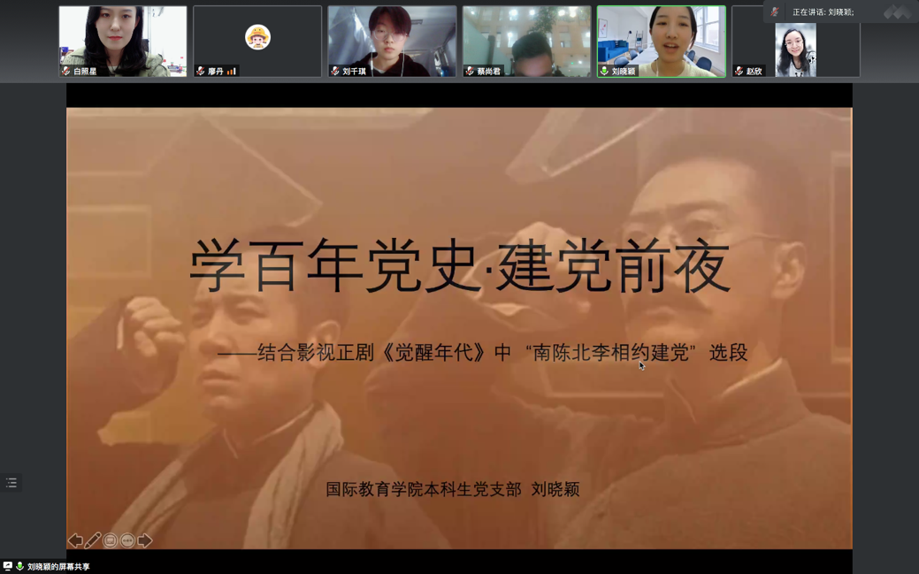 本科生党支部在线上开展了第四次“党员讲党课”系列学习活动。第四讲的主题为“学百年党史·建党前夜”。党课由支部书记白照星同志主持,由支部党员刘晓颖同志主讲,二人麻将