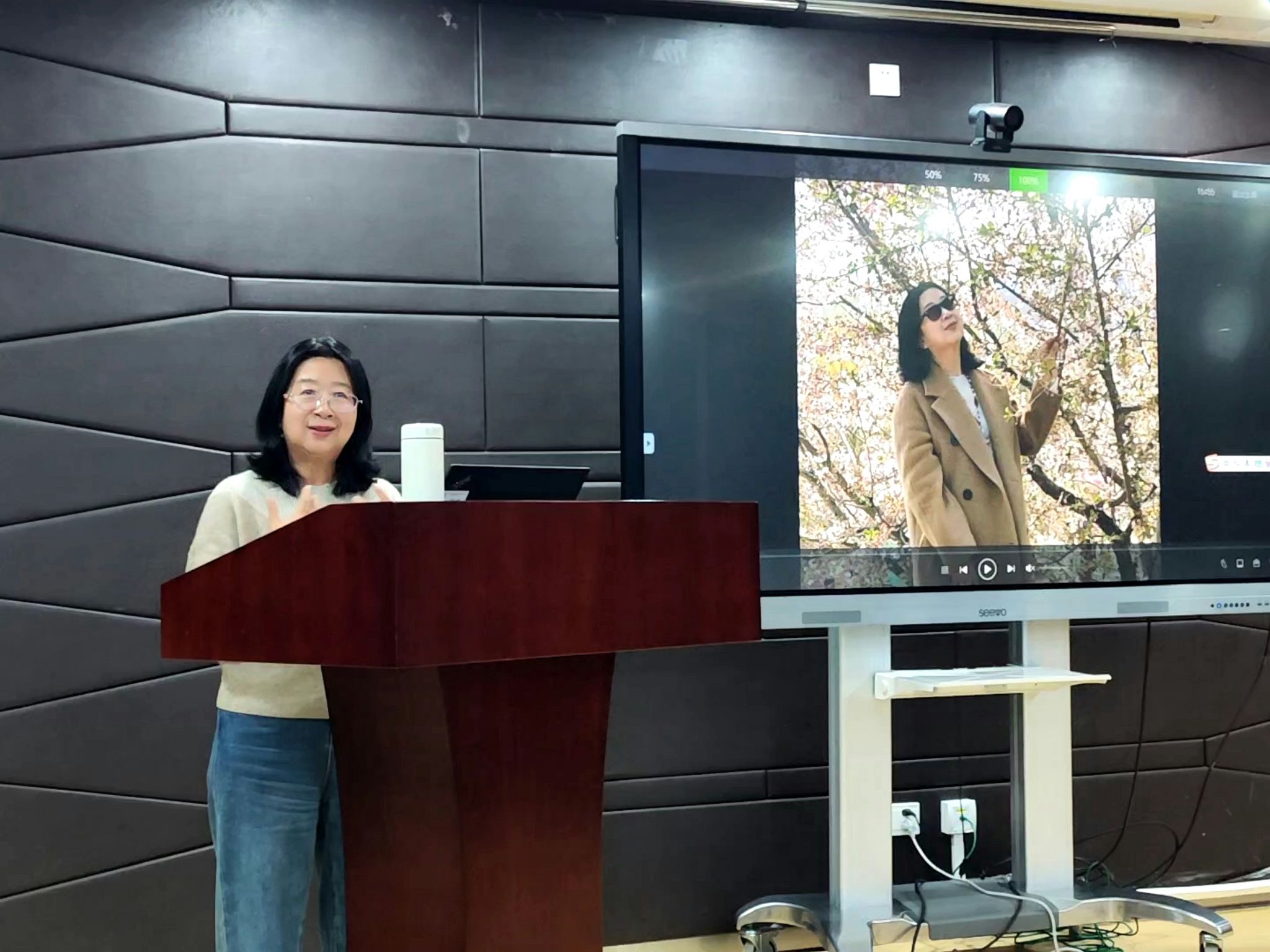 随后,资深党员刘玉屏教授为全体参会人员带来了一场精彩的学术讲座和经验分享。刘教授围绕生成式人工智能在教育领域的应用与实践,特别是其在国际中文教育中的应用,进行了深入浅出的讲解。她详细介绍了团队在微课制作方面的研究成果,包括如何按照要求做出高质量的课件、人机如何分工协作等关键问题,并展示了具体的微课作品和评价结果。