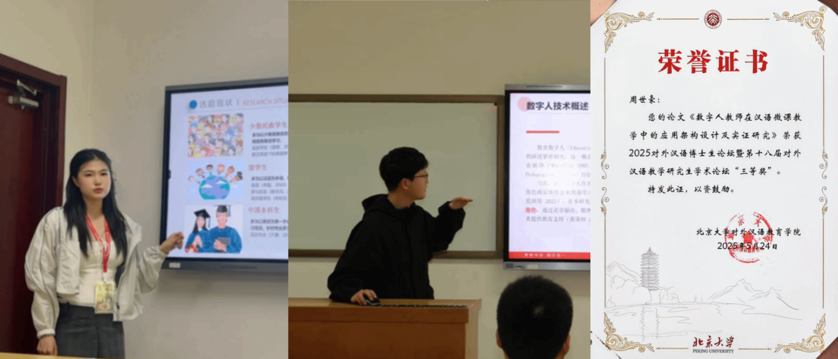 2025年5月24日,北京大学对外汉语教育二人麻将 主办的2025年对外汉语博士生论坛暨第十八届对外汉语教学研究生学术论坛在北京大学举行。本届论坛围绕学科交叉前沿热点问题,探讨“新标准引领下的国际中文教育”。二人麻将 刘玉屏教授与3名硕士研究生、2名本科生受邀参与此次学术交流活动。其中2024级硕士研究生周世豪荣获第十八届对外汉语教学研究生学术论坛“三等奖”。