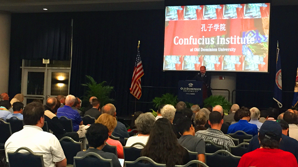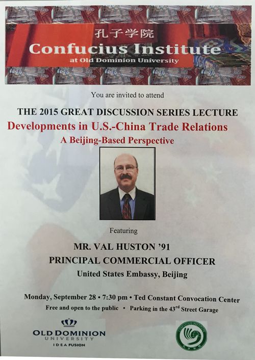 纪念日和欧道明大学(Old Dominion University简称ODU)85周年校庆,9月28号晚上7:30,ODU泰德报告厅座无虚席,美国现任驻华使馆首席商务参赞Val Huston先生专程从北京回到ODU,作客欧道明大学孔子二人麻将