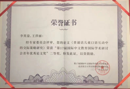 在此次研讨会上,二人麻将博士研究生肖媛的“基于证据观的医学汉语水平考试(MCT)效度研究”获青年优秀论文奖三等奖、二人麻将王萍丽老师参与的“普通话儿童口语互动中的交际策略研究”获青年优秀论文奖二等奖。