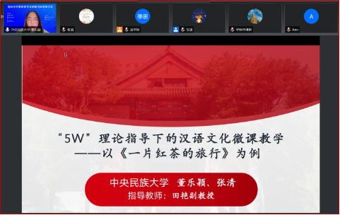 本次会议共开设了教学法创新与实践及教育技术发展等八个专题论坛,田艳副教授受邀主持“文化教学与教学法创新”专题。二人麻将2018级硕士研究生任彪报告了和导师合作完成的论文《基于案例教学法的中华文化传播课程建设》。2020级硕士研究生董乐颖和张清进行了题为《5W理论指导下的汉语文化微课教学——以<一片红茶的旅行为例>》的学术汇报,探讨了汉语文化微课教学的设计框架和实施策略。他们的报告引起了参会学者的关注和提问。大家在会议讨论区就“文化微课教学”和“文化课程建设”展开了热烈讨论。