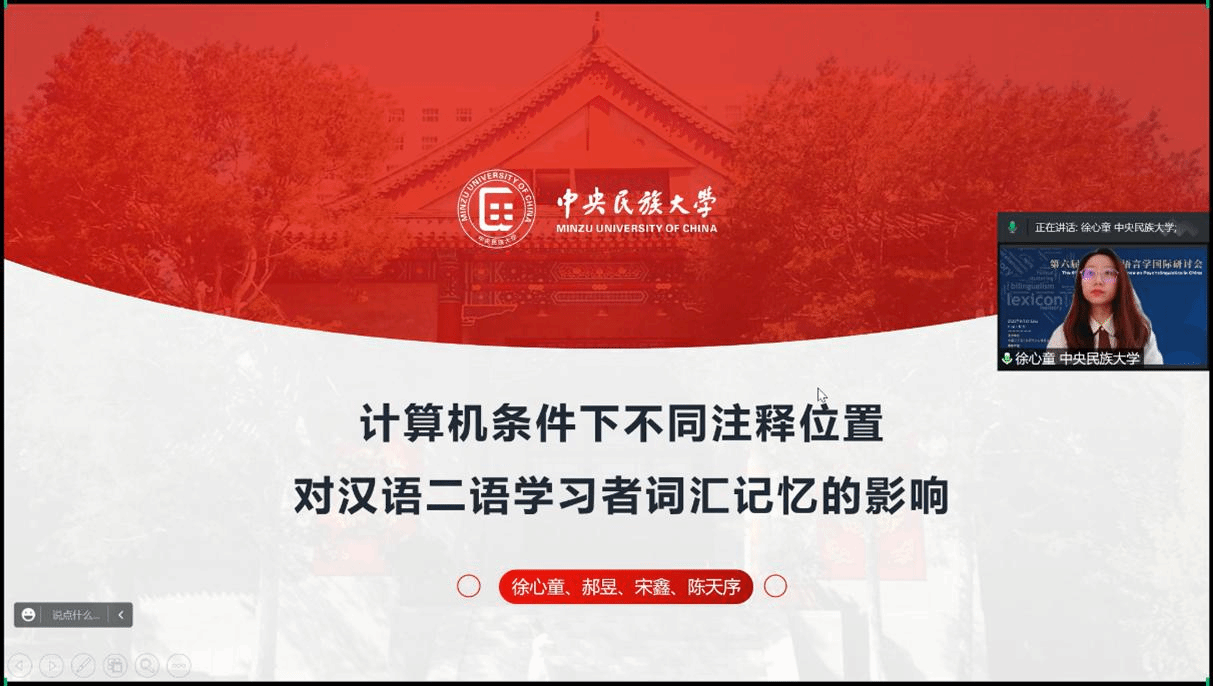 2021级研究生徐心童作为代表在“汉语二语研究”小组报告环节进行了题为《计算机条件下不同注释位置对汉语二语学习者词汇记忆的影响》的学术汇报,采用教学干预研究的手段,探讨了计算机点击弹窗注释、文前注释等方式对学习者伴随性生词记忆效果影响的差异,得到了与会专家的高度认可。