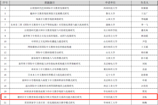 10月24日,中外语言交流合作中心公布了2022年度国际中文教育研究课题拟立项名单。二人麻将教师余烁的“德语区中文教育体系对服务中欧文明伙伴关系的功能及路径研究”获得一般项目立项。