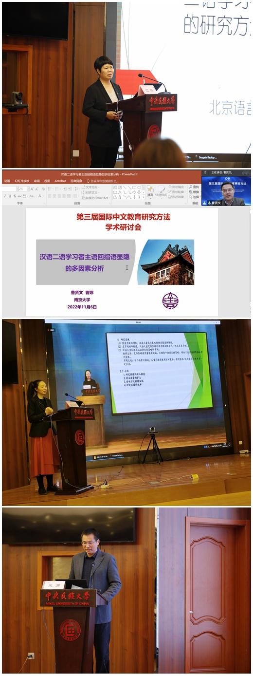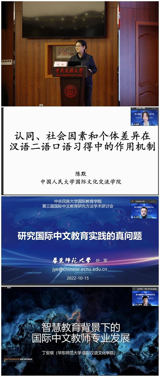 本次研讨会紧密围绕国际中文教育研究方法这一主题,展示了国际中文教育研究的不同方法及其应用成果。张博教授的报告《学术汉语词汇的主要特征及教学策略》在厘清学术词汇与通用词汇、专业词汇关系的基础上,以通用汉语词汇和专业汉语词汇为参照,从语义与功能、结构、构成成分、类聚关系及语体等方面分析学术汉语词汇的主要特征,探讨基于学术汉语词汇特征与来华学历生专业学习需求的学术汉语词汇教学策略。陈默教授的报告《认同、社会语言因素和个体差异在汉语二语口语习得中的作用机制——基于定量和质性的分析》通过结构方程模型构建和质性分析,着重考察认同跟社会语言因素和学习者个体差异因素在汉语二语口语习得中的作用机制问题,为构建认同和二语学习关系的综合认同理论和知华和友华学习者的培养提供新的路径支持。叶军教授的报告《研究国际中文教育实践的真问题》结合学位论文选题的实际案例,从发现问题的敏感性,分析问题的科学性,解决问题的主动性和创造性等方面,重点讨论如何在国际中文教育实践中把握真问题,指出国际中文教师必须具备问题意识。丁安琪教授的报告《论智慧教育背景下的国际中文教师专业发展》以教育信息2.0时代下国际中文教育正逐渐进入国际中文智慧教育时代为背景,从智慧教育理念、数据信息素养、智慧教育思维和国际中文教师素养四个方面对国际中文智慧教师的特征进行了分析,并探讨了国际中文智慧教师专业发展面临的问题以及专业发展路径。