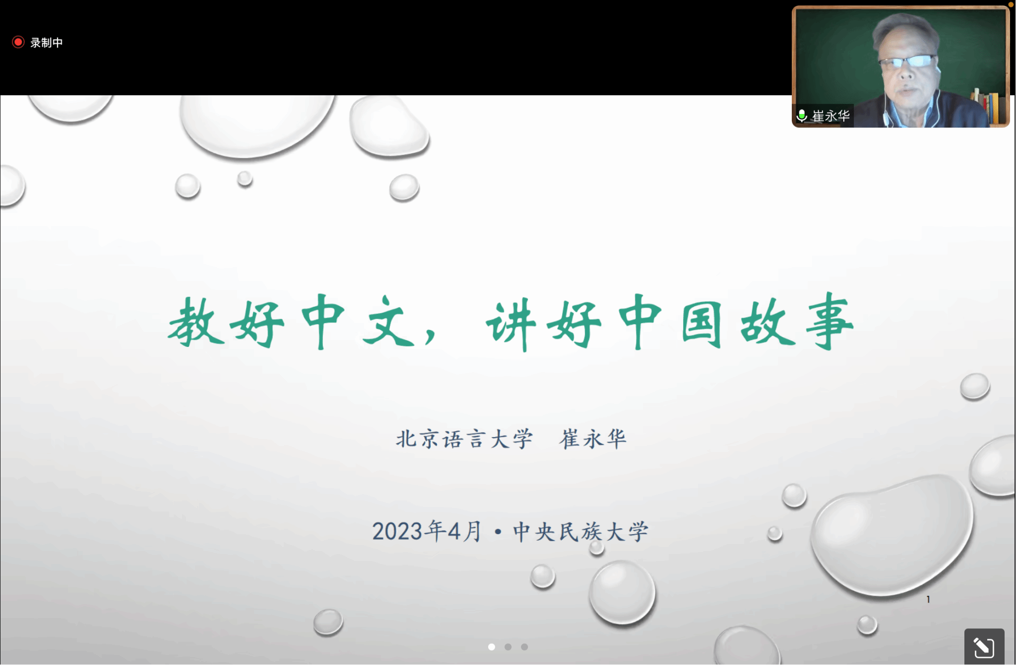 在讲座中,崔永华教授介绍了“百年未有之大变局”时代背景下,国际中文教育表现出的国际化、低龄化、职业化、网络化与科技化的趋势。然后从广度、深度和力度三个层面肯定了国际中文教育界在传讲中国故事方面做出的无可替代的贡献。最后,崔永华教授将讲好中国故事置于国家和民族事业的高度,并从四个层面对新时代讲好中国故事提出了深刻的思考:增强讲好中国故事的理念;探索语言教学和讲好中国故事的有机融合;从时代特征出发,厚今薄古、古今兼顾、以今为主;针对不同群体,学会分众化、本土化的表达。