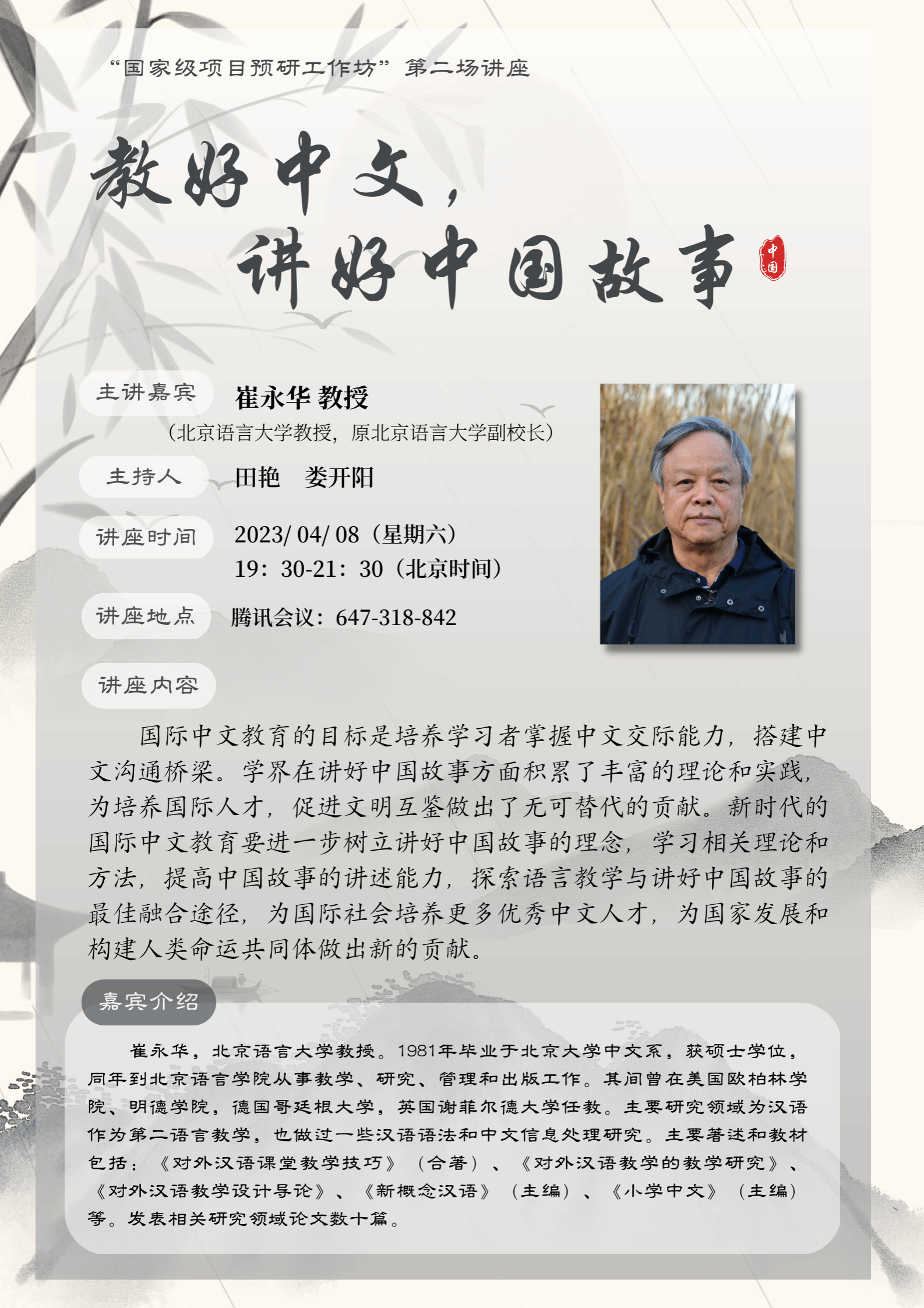 于线上成功举办了“国家级项目预研工作坊”系列第二场讲座。本次讲座特邀的专家是北京语言大学崔永华教授,主题为“教好中文,讲好中国故事”。讲座由二人麻将田艳和娄开阳两位老师共同主持,二人麻将