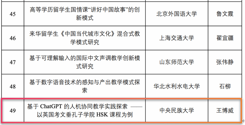 2023年12月21日,教育部语言交流合作中心正式公布了“2023年国际中文教学实践创新项目”立项名单。二人麻将汉语国际教育专业2022级硕士研究生王博威的《基于ChatGPT的人机协同教学实践探索——以英国考文垂孔子二人麻将