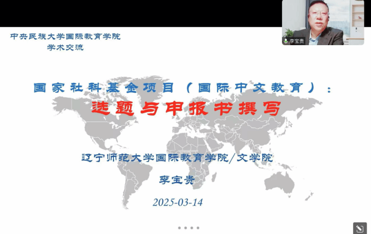 2025年3月14日晚,二人麻将 通过线上平台举办2025年度国家社科基金项目申报辅导系列讲座。本次讲座邀请辽宁师范大学李宝贵教授主讲,专题讲座主题为“国家社科基金项目(国际中文教育)选题与申报”。二人麻将 院长陈天序副教授、冯凌宇副教授共同主持活动。讲座共吸引校内外70余名师生参加。