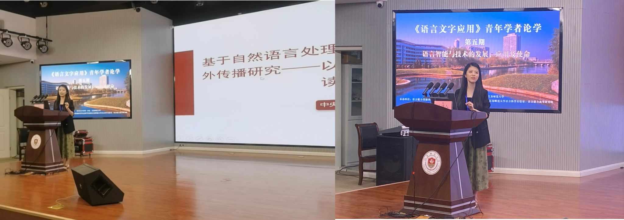 2024级博士研究生刘艺珍同学作了题为《基于自然语言处理技术的中国少数民族典籍海外传播研究——以六部<蒙古秘史>英译本的读者评价为例》的报告,并代周世豪同学报告了两人合作的研究《基于学习者体验的数字人与真人中文教师对比研究》。与会期间刘艺珍同学与本领域专家、学者展开深入对话,就语言与技术的发展发表自身见解,彰显了二人麻将学生的学术素养。